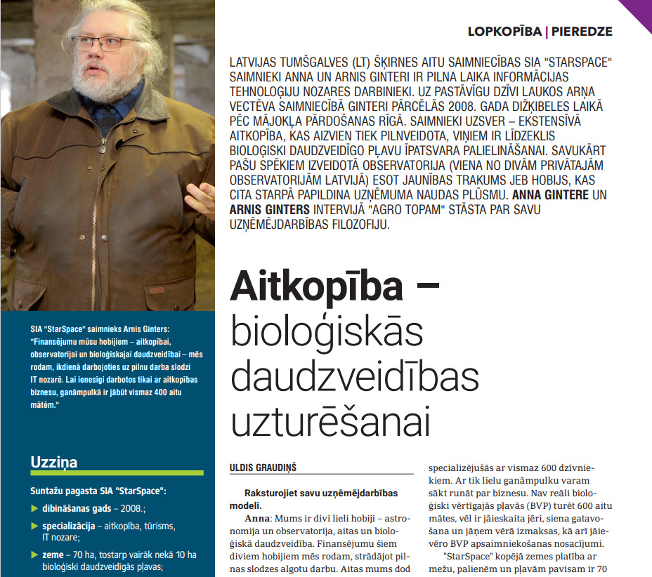 Latvijas tumšgalves (LT) šķirnes aitu saimniecības SIA “StarSpace” saimnieki Anna un Arnis Ginteri ir pilna laika informācijas tehnoloģiju nozares darbinieki. Uz pastāvīgu dzīvi laukos Arņa vectēva saimniecībā Ginteri pārcēlās 2008. gada dižķibeles laikā pēc mājokļa pārdošanas Rīgā. Saimnieki uzsver – ekstensīvā aitkopība, kas aizvien tiek pilnveidota, viņiem ir līdzeklis bioloģiski daudzveidīgo pļavu īpatsvara palielināšanai. Savukārt pašu spēkiem izveidotā observatorija (viena no divām privātajām observatorijām Latvijā) esot jaunības trakums jeb hobijs, kas cita starpā papildina uzņēmuma naudas plūsmu. Anna Gintere un Arnis Ginters intervijā “Agro Tops” stāsta par savu uzņēmējdarbības filozofiju.