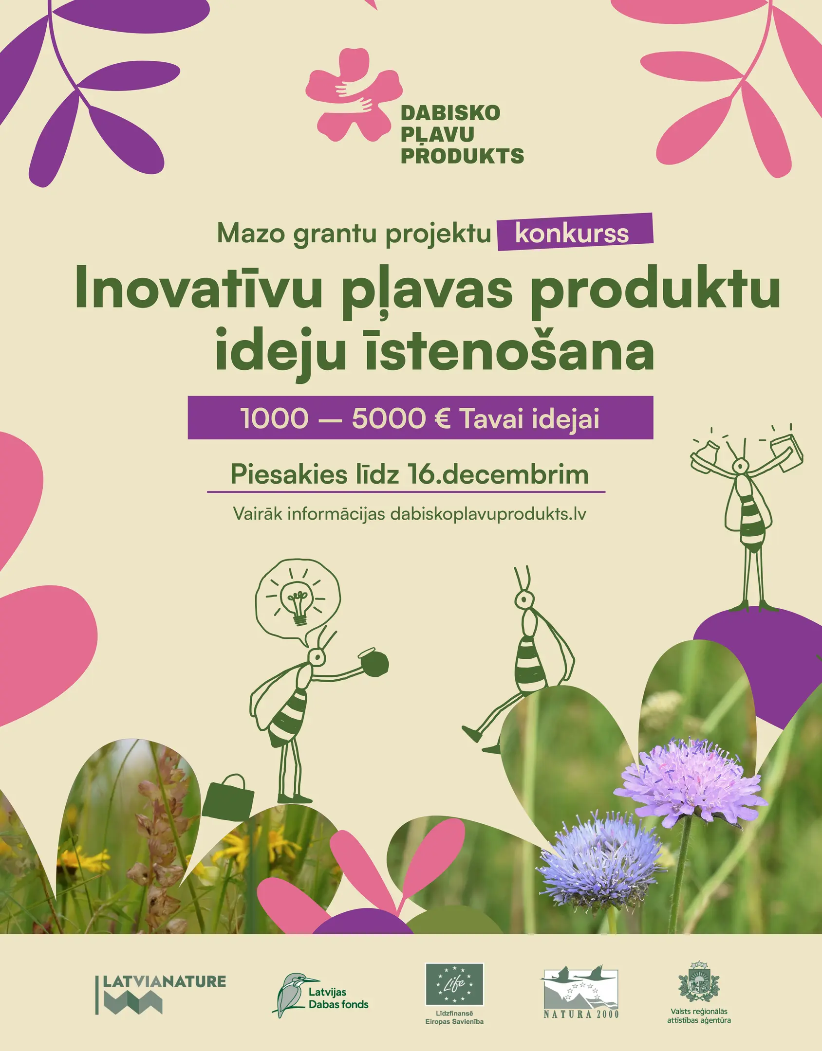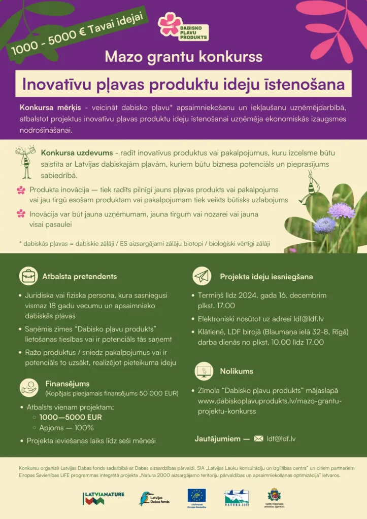 Latvijas Dabas fonds sadarbībā ar Dabas aizsardzības pārvaldi, Lauku konsultāciju un izglītības centru un citiem LIFE-IP LatViaNature projekta partneriem aicina dabisko pļavu* apsaimniekotājus piedalīties mazo grantu konkursā “Inovatīvu pļavas produktu ideju īstenošana”. Konkursa mērķis ir veicināt dabisko pļavu apsaimniekošanu un iekļaušanu uzņēmējdarbībā. Pieteikumi iesniedzami līdz 16. decembrim.