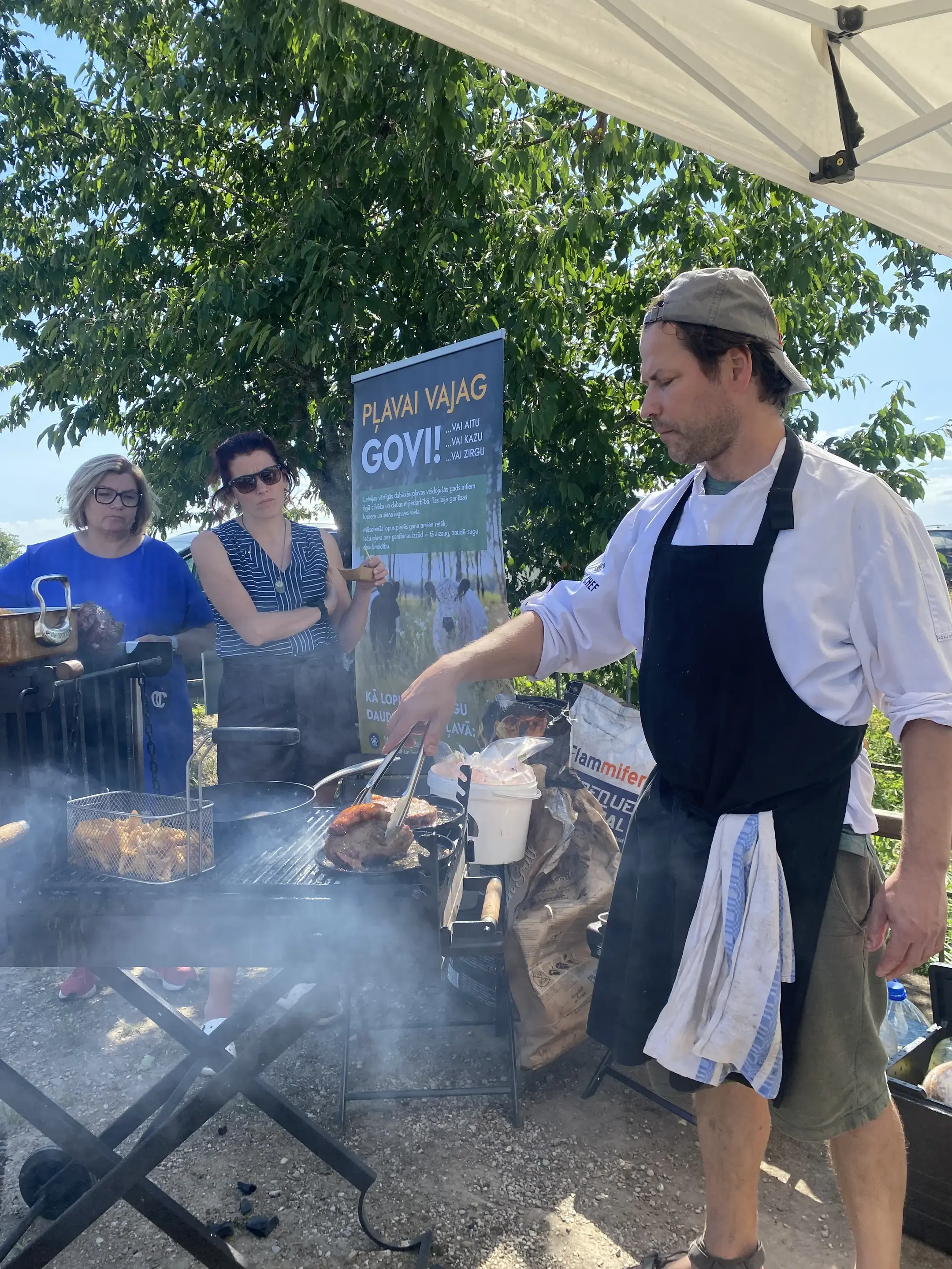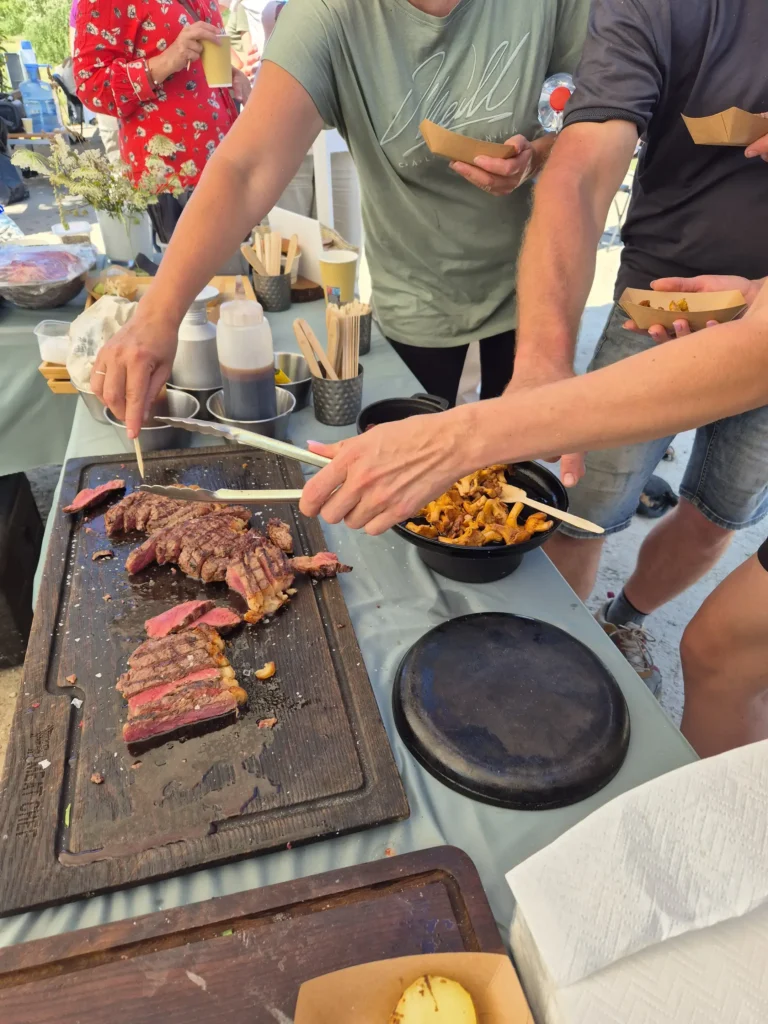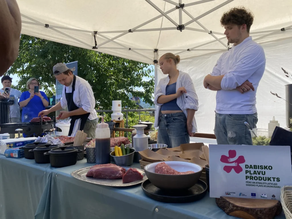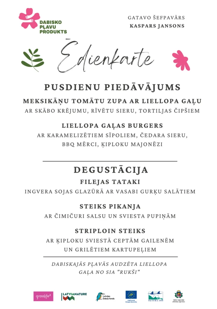 Devāmies ekskursijā – izzinošā pārgājienā Latvijas Dabas fonda pļavu ekspertu Baibas Strazdiņas un Līgas Gavares, un entomologa Voldemāra Spuņģa pavadībā. Atgriežoties pēc apmēram 6 km garā pārgājiena visiem bija lieliska apetīte pusdienām, kam sekoja degustācijas. “Meat Chef” šefpavāra Kaspara Jansona vadībā iepazināmies ar dabiskajās pļavās audzētu liellopu gaļas gatavošanas un garšas niansēm un degustējām izcili garšīgus steiku, pikaņju un fileju. Liellopu gaļu mums laipni sagādāja pļavu saimnieki SIA “Rukši”.