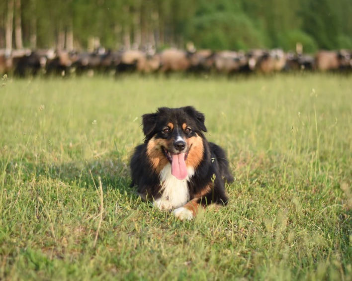 Aitas gana, kā arī vistas un pīles uzrauga gudrie un skaistie Austrālijas aitu suņi, kas vienlaikus ir mājas mīluļi.